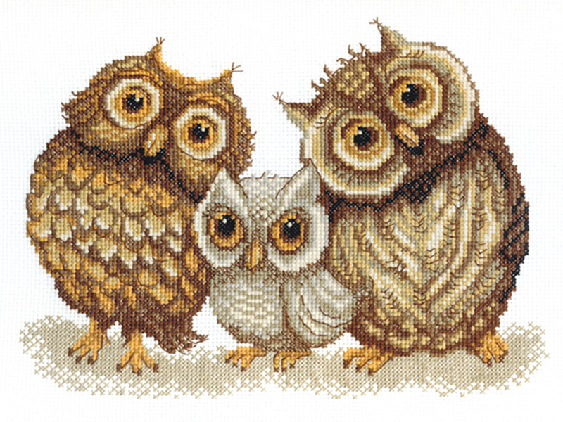 【キット作り方つき】愛嬌のある表情が可愛らしい、縁起のいいフクロウの親子をクロスステッチで。中級の方向き。