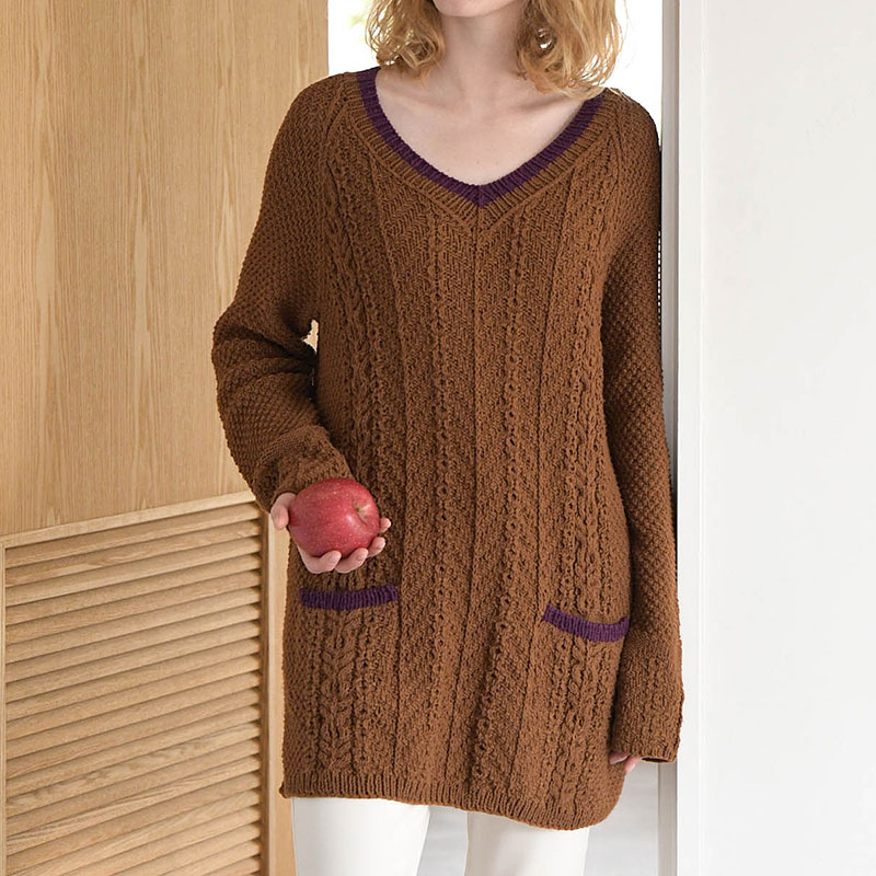 細かいXOパターンとヘリンボーンパターンを組み合わせて。ウールアレルギーの方にお勧めしたいふっくらしたアクリルヤーンは、タオル地のように気持ち良く仕上がります。広めのVネックで衿元はすっきりと。アクセントカラーの紫を効かせて。