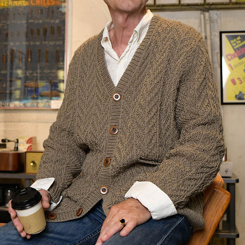 右ページと同じヘリンボーンパターンを展開してメンズカーディガンに。トラッド感のある落ち着いた仕上がりは、年齢を重ねた男性だけでなく、若い人にも良く似合います。合わせを変えればもちろん女性にも。[サイズ]胸囲128cm、背肩幅44cm、丈73cm、袖丈59cm。
