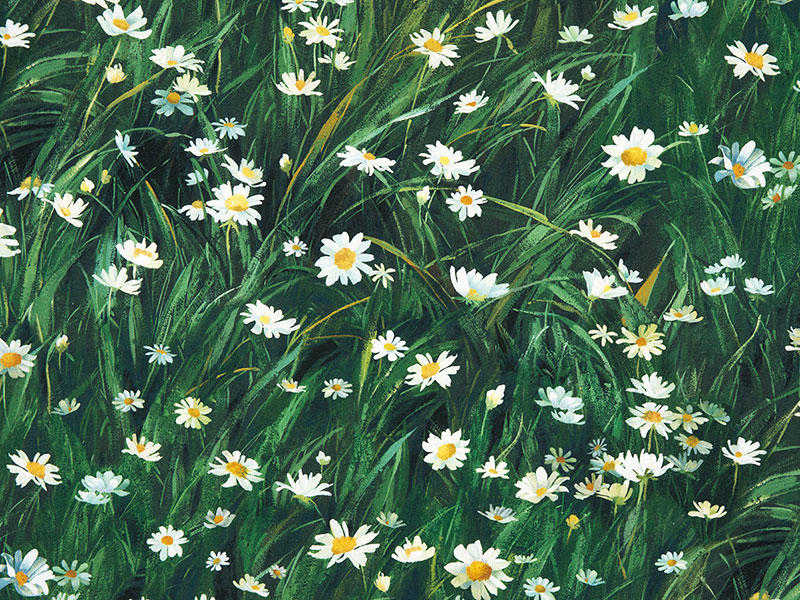 [デジタルプリント]緑が生い茂る草原に咲く、可憐なマーガレットを描いたデザインです。パーテーションやクッションなどインテリアにお勧めです。