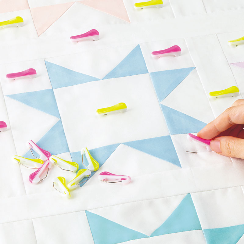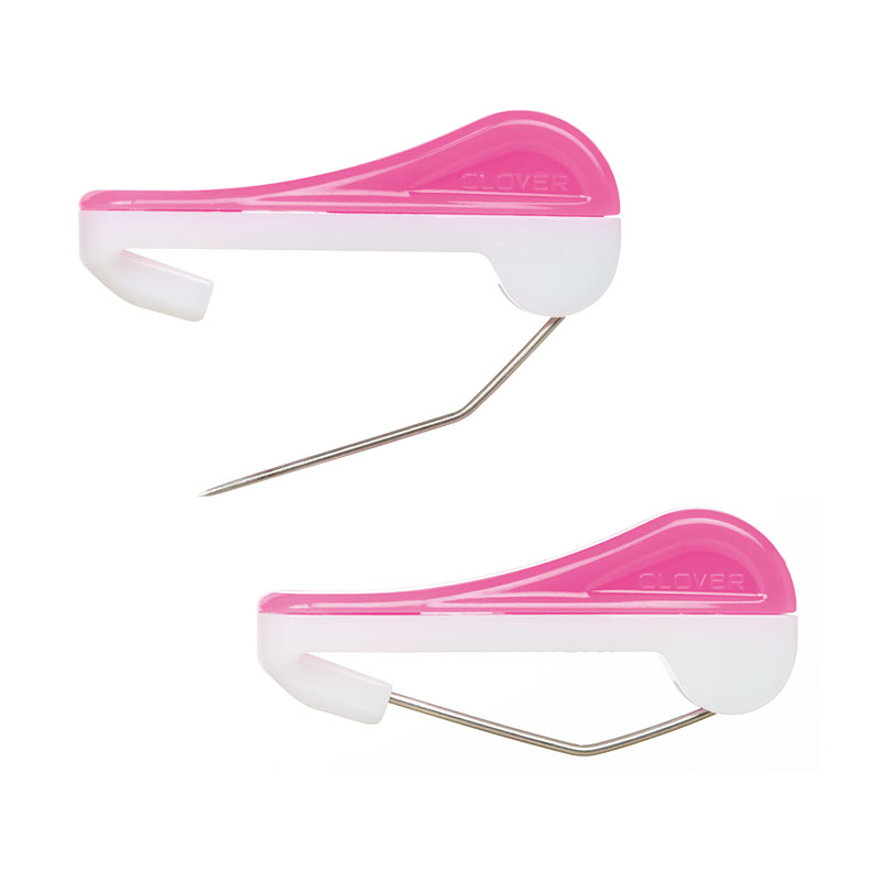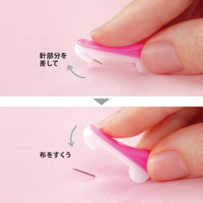 生地がすくいやすい、ピン部分が曲がった形状のしつけピン。押すだけで針を開閉できるので、指を痛めることなくスピーディーに作業できます。キルティングやミ シンキルトのしつけにお勧め。