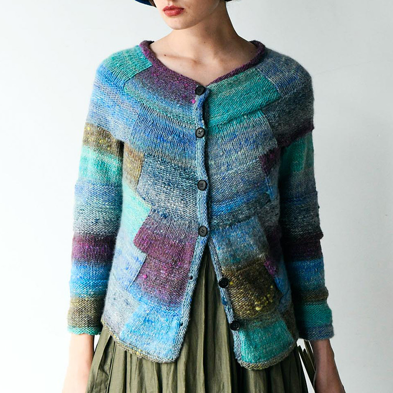 材料:野呂英作 雅 紫・青・緑・茶系(1)360g/4カセ。直径20mm のボタン6 個。