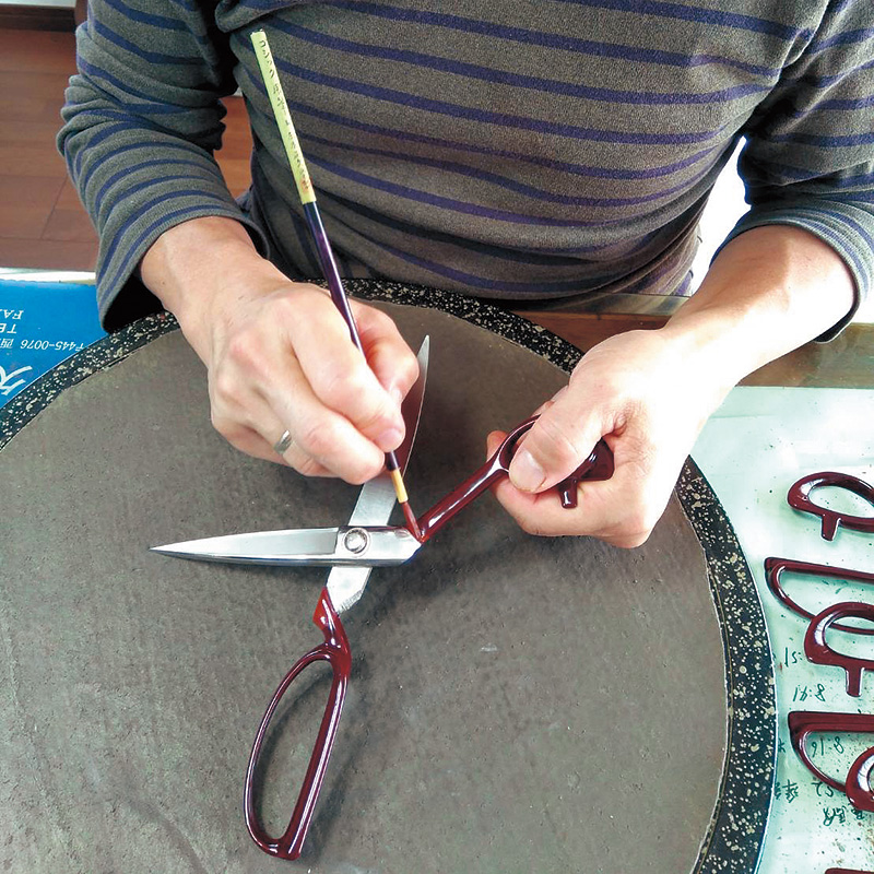 兵庫県小野市のはさみに、愛知県名古屋市の漆塗りが高貴なつやを放つ裁ちばさみ。天然漆ならではの微妙な色変化と、使うほどに深まる味わいが魅力の逸品です。