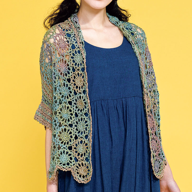 次々と変化するグラデーションヤーンの魅力をたっぷりと味わえるマーガレットです。ショールのようにつないだ丸モチーフで前立て&前身頃から肩をぐるりと覆い、後ろ身頃の下半分と袖を編み出しています。単色糸を差し色にしたバランス感が絶妙です。