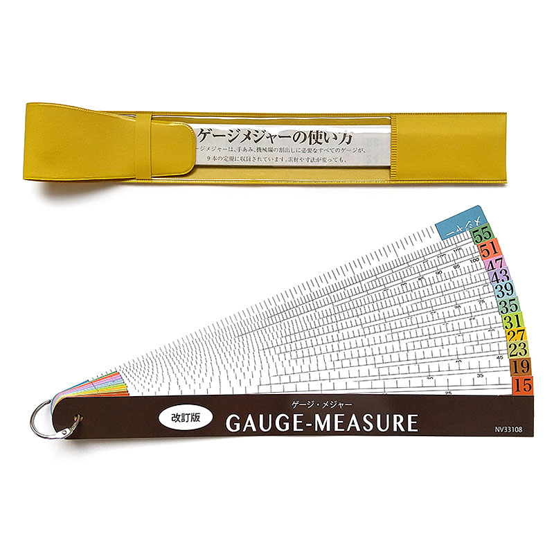 ▲▼手編み、機械編みの割り出しに必要な、12から57までのすべてのゲージが12本の定規に収録されています。