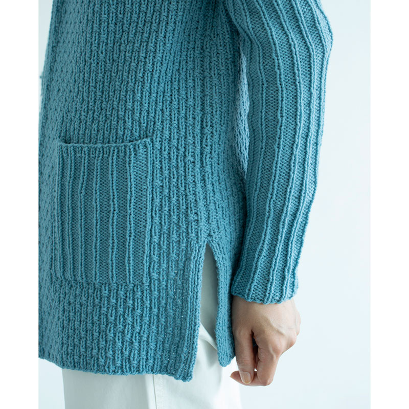身頃まわりは1目ゴム編みにして、前衿ぐりの減らし目から後ろの衿へと続けて編みます。縁編みなしのデザインです。ポケットは別に編んで後から貼りつけます。爽やかなグレイッシュブルーで、長め丈も軽やかな印象。