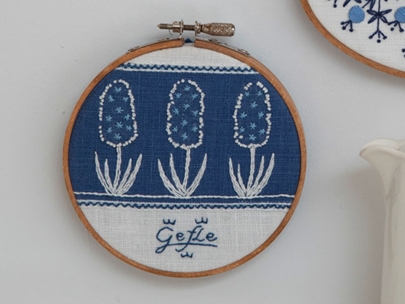 スウェーデンの「ゲフレ(GEFLE)」という陶器に描かれた、絵皿を刺しゅうで描きました。鮮やかなブルーのリネンも素敵です。刺しゅう枠つきのキットになります。
