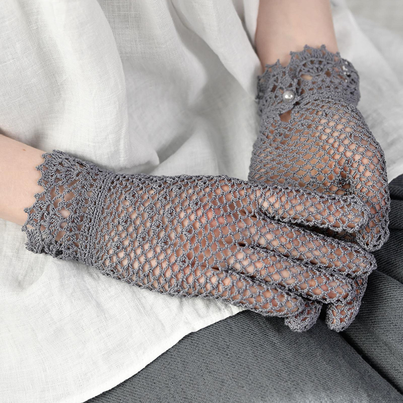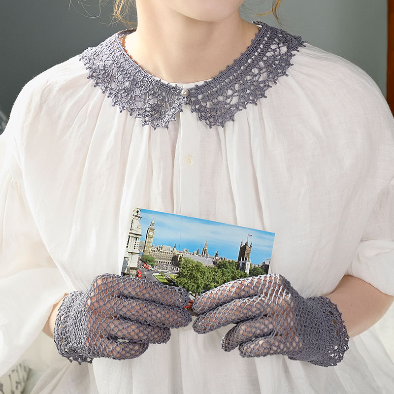 レディな気分が高まるセットは、細めの40番レース糸で丹念に仕上げましょう。太めのエジングをそのままつけ衿にし、クロッシェグローブの縁にもアレンジしてあしらいます。繊細なデザインの手袋は構造がちょっと複雑に見えますが、実際に編むのはほとんどネット編みなので、図にひるまずぜひ編んでみてください。