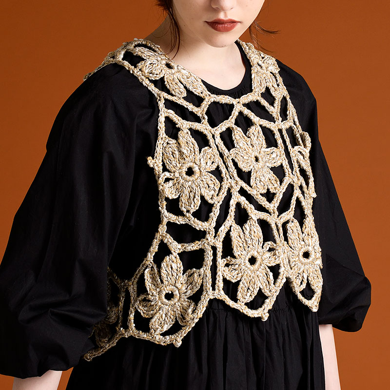 流行のモチーフを大きく編んで、重ね着用のおしゃれベストに。「シュクレ」はラメ糸も引き揃えられているのでさりげない輝きがあります。贅沢なアクセサリーのように身につけてください。