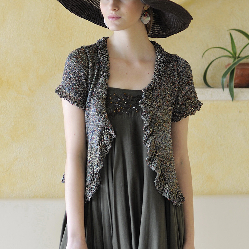 グリーン系のラメ入りファンシーヤーンの素材感を生かしてメリヤス編みで編んだ半袖のボレロ。縁回りはかぎ針編みのネット編みにして華やかなフリルで飾りました。