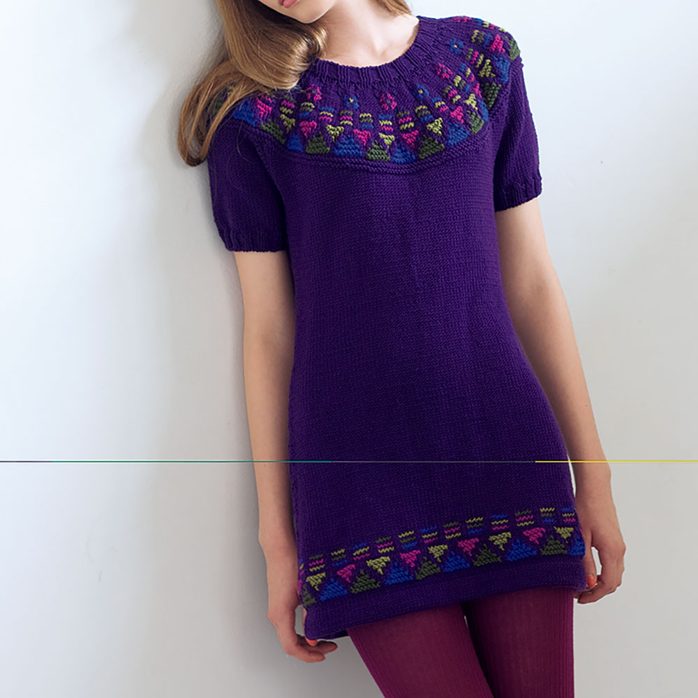 裾と丸ヨークに入れた4色のガーター編み込みが楽しいチュニック・プル。パープル地に映えるリッチな配色が小粋です。