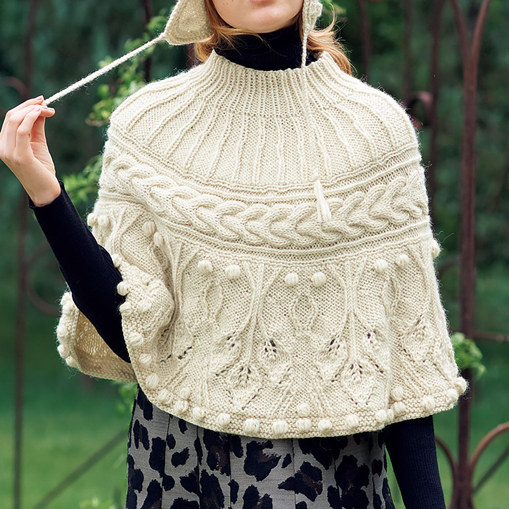 木の葉の束、ダブルケーブル、リブ、ボッブルを組み合わせたショート・ポンチョ。防寒とお洒落が楽しめる冬こものです。
