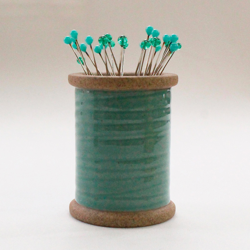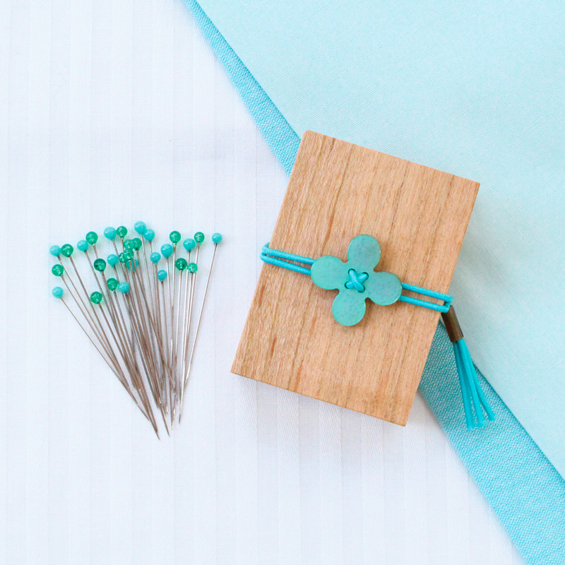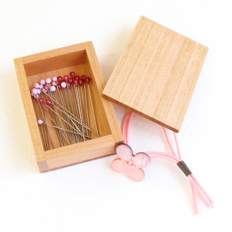 【限定50】頭が小さく布通りなめらかな広島のまち針セットを、美しい貝ボタンつきの帯を掛けた木箱に入れてお届けします。
