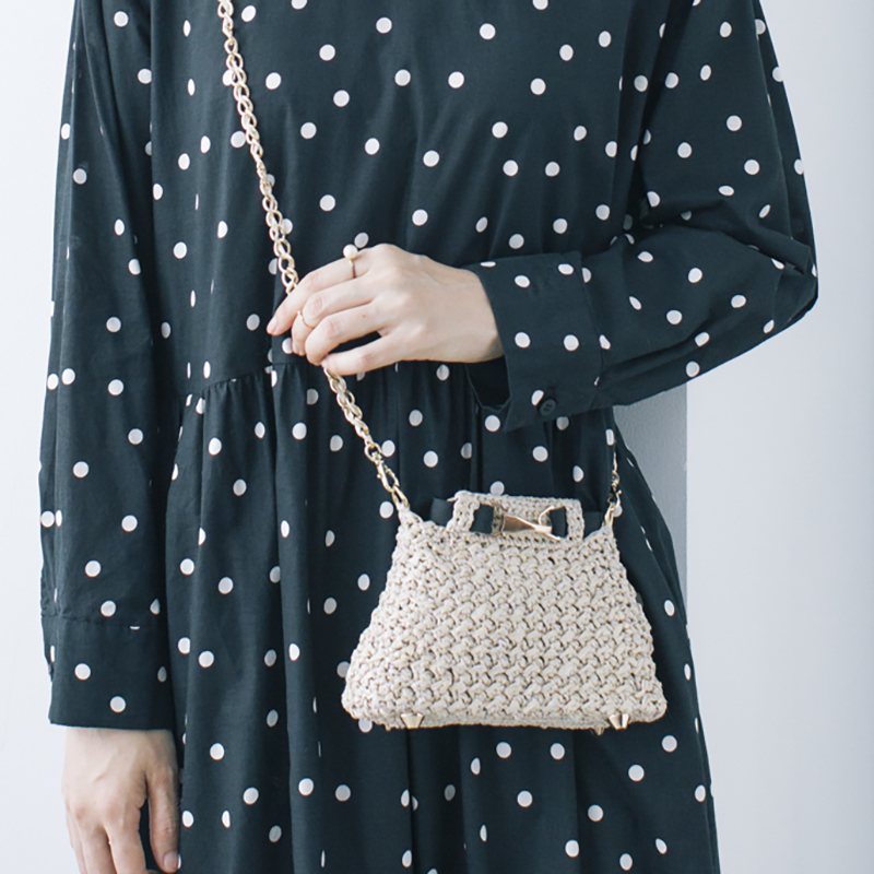 ラフィア風ヤーンとラメ糸のコンビで作る、キラキラした編み地。底鋲やフック、黒いリボンのあしらいで、ラグジュアリー感もアップ。