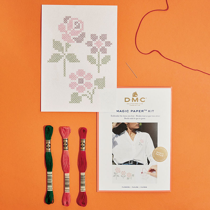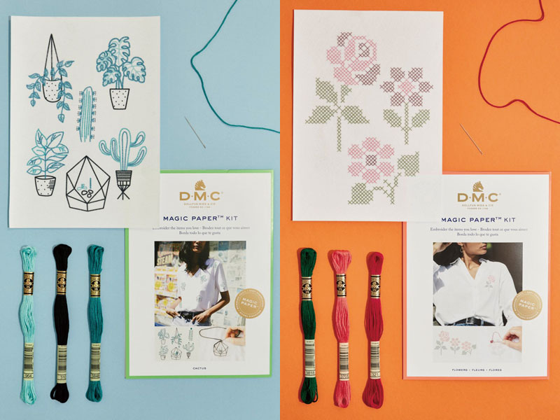 図案印刷済みマジックペーパー(15×21㎝)、DMC25番刺しゅう糸、刺しゅう針、簡単な説明書(英語・仏語)