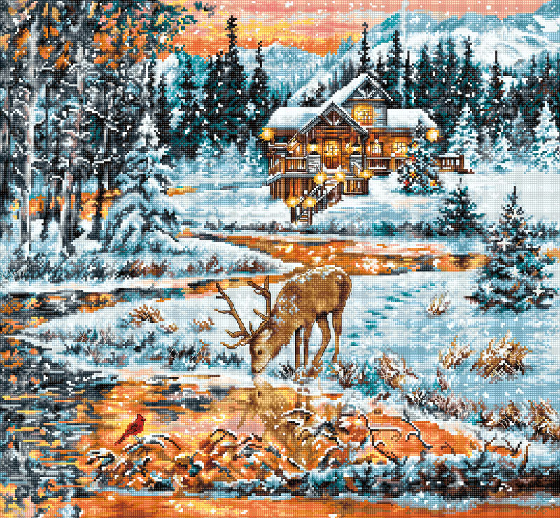 【キット作り方つき】夕陽が映る川面や水を飲むシカなど、情感溢れる冬景色を描いたクロスステッチ作品です。上級の方向き。