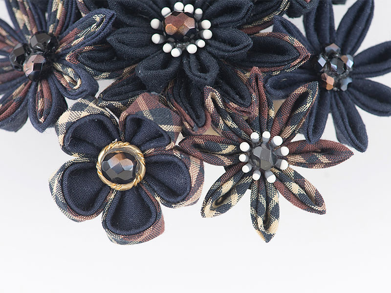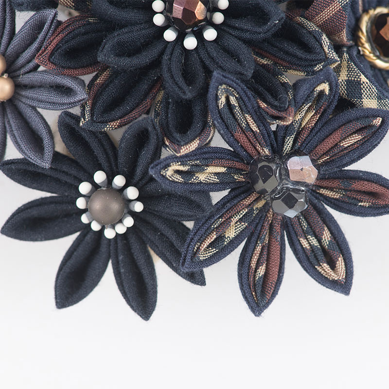 【キット作り方つき】 つまみ細工作家・つゆつきさんデザインのつまみ細工のコサージュ。一番人気のデザインを、先染め布も使い、ちょっとカジュアルな雰囲気に仕上げました。8輪からなる豪華な作品は、晴れの日に、普段使いにと様々に活躍します。カット済みの布が入っているので、すぐに作り始められます。