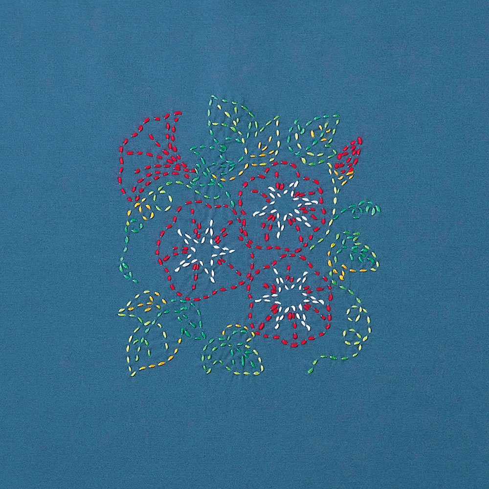 季節の花や果実をモチーフにした図案が印刷済みの風呂敷に、ちくちく刺し子を施して仕上げるキットです。縫製済みなので、刺しゅうを楽しむだけで完成します。