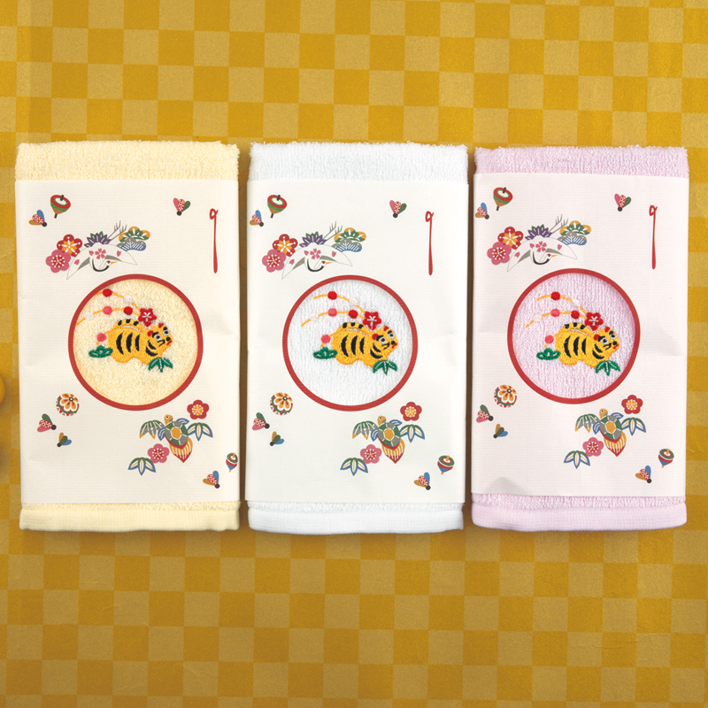【限定120】【キット作り方つき】お年賀品として毎年人気。日本製の干支タオル3色セットです。おめでたい柄を配したのし紙の丸窓から、干支の刺しゅうがのぞきます