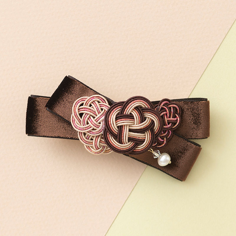ビーズアクセサリー作家、Kellyさんデザインの水引アクセサリー。シックなカラーの水引やベルベットリボン、上品な淡水パールを使用した洗練されたデザインのバレッタ。和の伝統工芸の技法を使いながらも洋風の雰囲気をあわせ持つアクセサリーは普段使いにもぴったりです。
