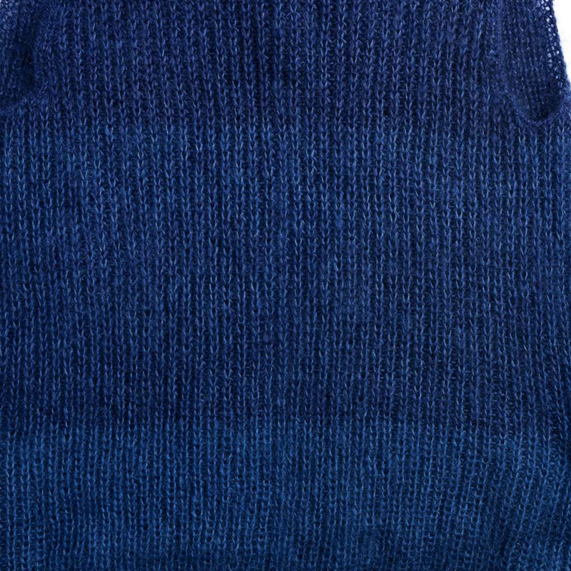 片面引き上げのイギリスゴム編みで編んだロング丈のベストは、モヘアで軽い仕上がりに。全体をブルー系2色の3本どりで編み、3本の色の組み合わせで濃淡のグラデーションを作っています。新しい配色の発見は、手編みならではのお楽しみ。