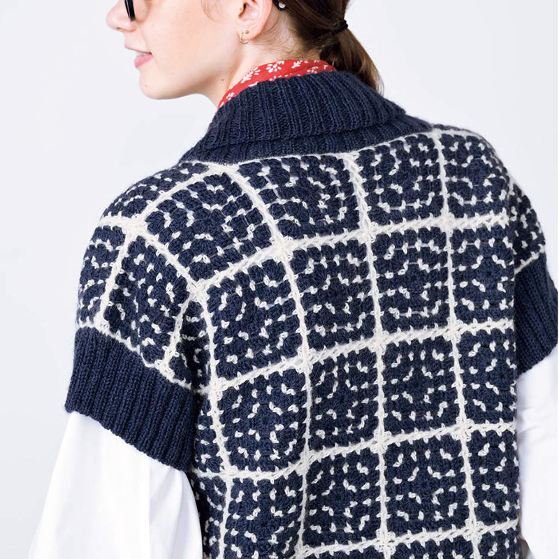 紺と白のコントラストが、どこか和テイストで懐かしい雰囲気。配色したモチーフがこぎん刺しのようにも見える趣のあるベストです。打ち合わせは重ねてとめるスタイルなので、スポンとかぶれて、脱ぎ着も楽々です。
