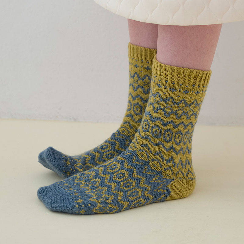 材料:Keito ホットレイ ソックヤーン ブルー40g/1玉、イエロー35g/1玉。