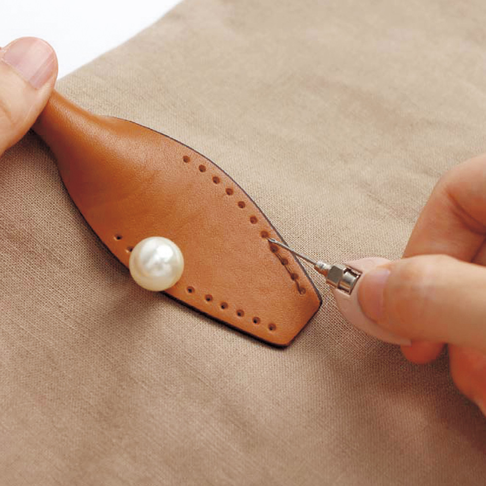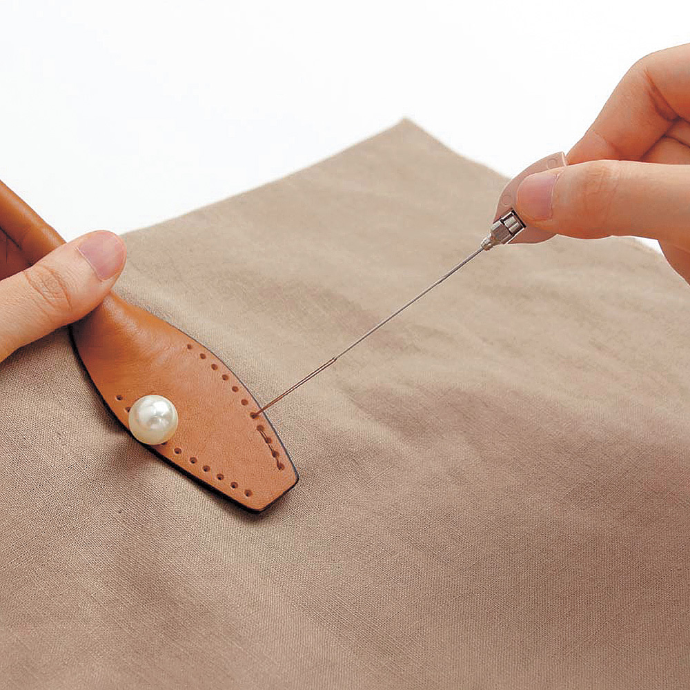 バッグの持ち手や口金、ボタンやラベルなどをつける時、裏側から想いの位置に針を出すのは簡単ではありませんが、これを使えば裏側から表側の刺したい位置に一度で正確に刺すことができ、とても便利です。