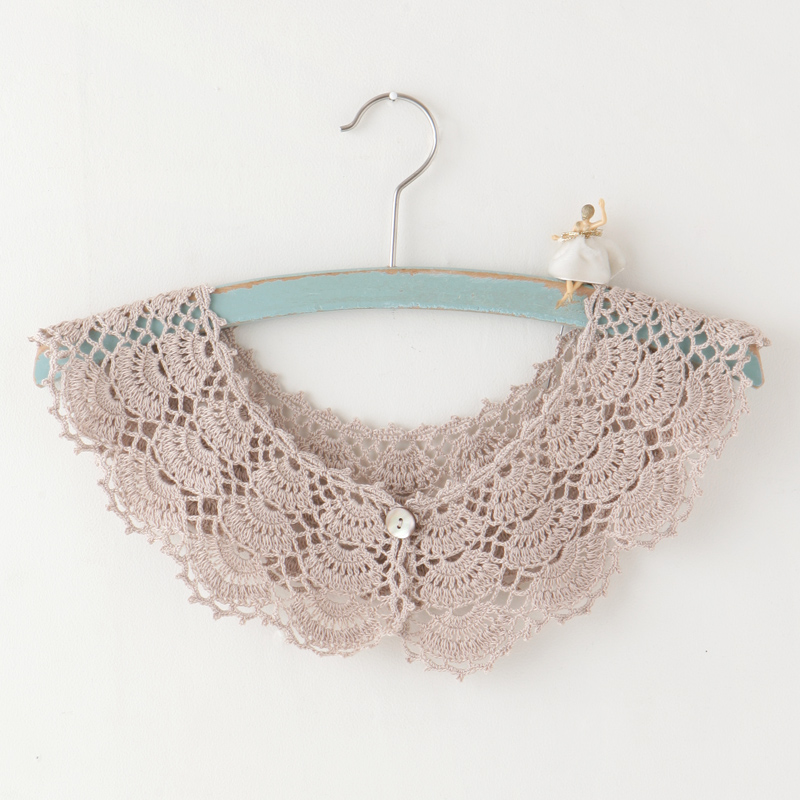 スタンダードなつけ衿は、シェル模様の最終段を玉編みにしてボリュームを出しました。ピコット入りの縁編みでキュートさをプラス。