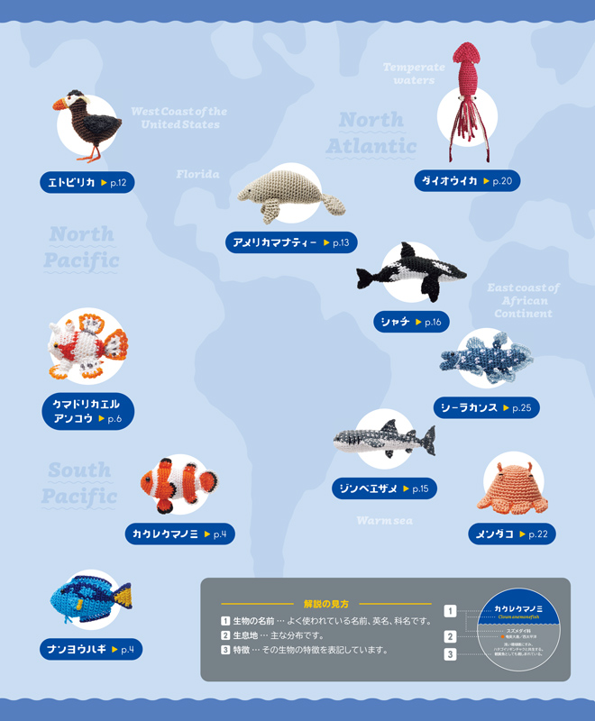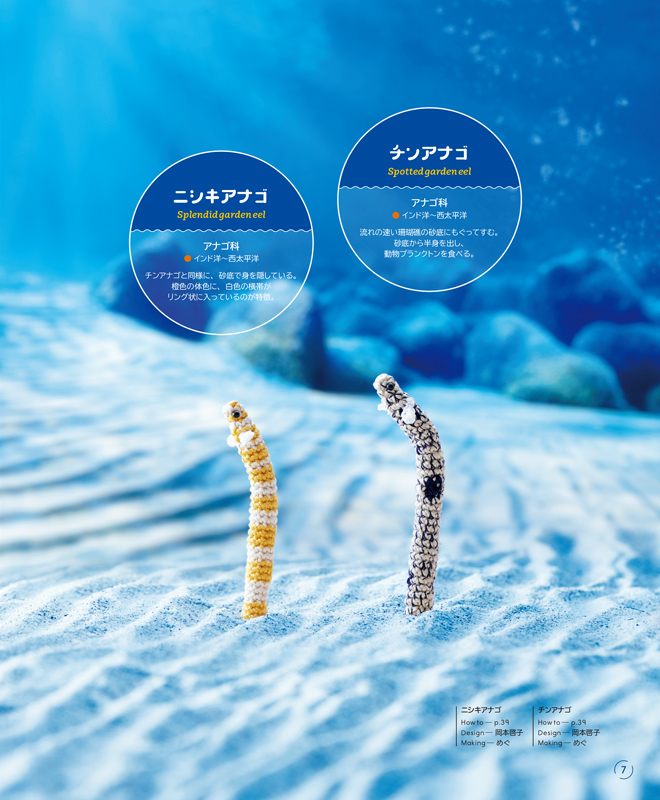 刺しゅう糸で編むミニチュアシリーズ。今回は、ちょっと珍しい海の生物をテーマに、図鑑形式で各生態とともに紹介する作品集。作品は、カクレクマノミ、ダンゴウオ、メンダコ、ダイオウイカなど小さな生き物から深海魚まで24点紹介。糸は色数豊富で、よりリアルに表現できる25番刺しゅう糸を使用。