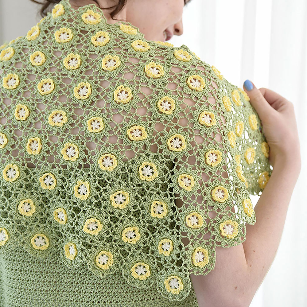 立体的なお花が可愛いモチーフつなぎのアンサンブル。きれいな若草色に白と黄色を散らして一面に並べたショールは春のお花畑のようです。 ※こちらのレシピはショールのみです。