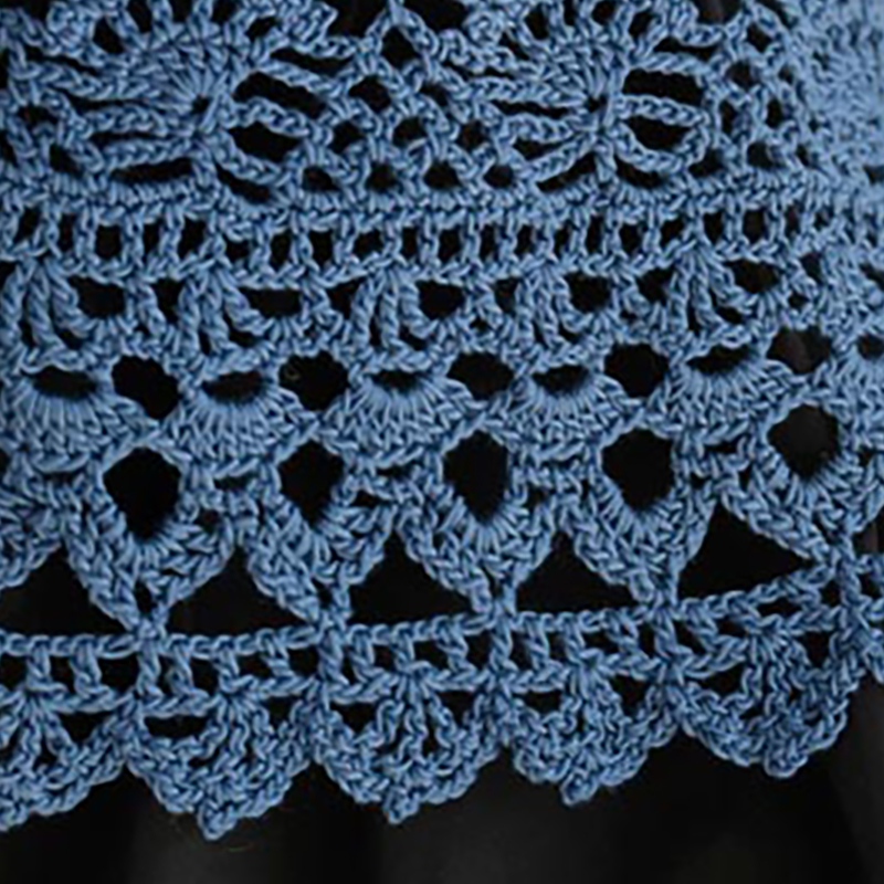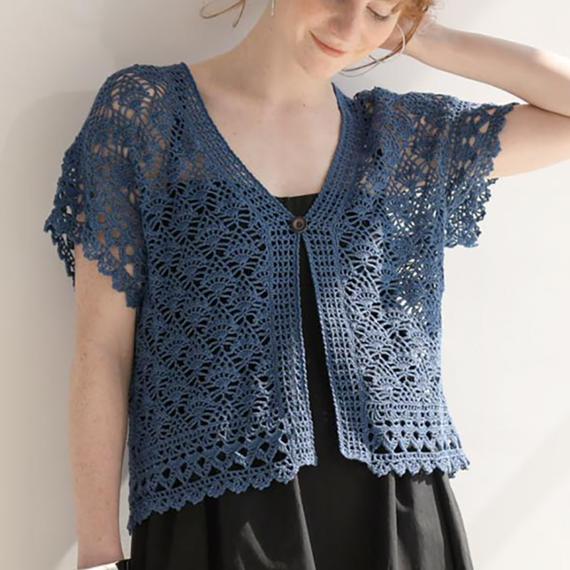 小さなパイナップル模様を一面に並べたゴージャスな模様を、ネイビーでシックに編み上げて。クロッシェレースらしい品の良いボレロカーディガンですが、太めの前立てがエレガントさを抑えてくれるのでカジュアルスタイルに合わせるのもおすすめ。