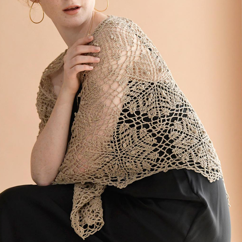 落ち着いたアースカラーが目を引くクンストレースのモチーフを、かぎ針でモチーフつなぎにしたハイブリッドなショールです。中心から編む棒針編みの花モチーフと、かぎ針編みのネットが違和感なく混ざり合った新鮮なニュアンスに惹かれます。