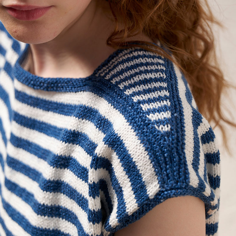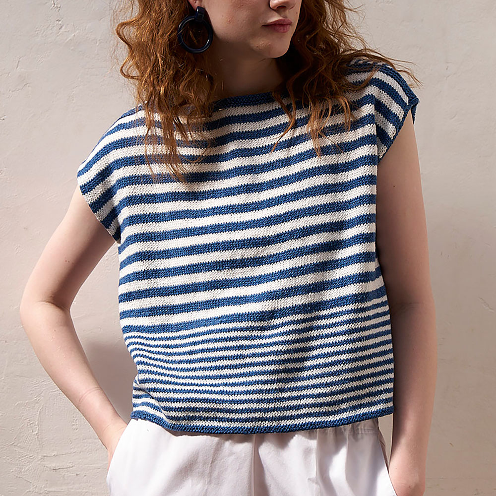 簡単に編んでTシャツのように着られるまっすぐ編みのボーダーニットは、直線のスラッシュド・ネックに三角マチをプラスして、オシャレ度&着やすさアップ! 太さを変えたボーダーが、都会的なマリンスタイルを演出してくれます。