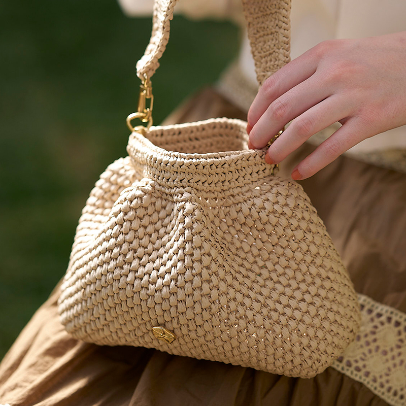 コロンとした丸い形が可愛らしいバッグ。開け口はバネ口使用なので、使い勝手も良く、見た目以上に物も入ります。共糸で編むストラップは短めのハンドバッグサイズですが、簡単に取り替えられるスタイルなので、お好みでチェーンをつけて楽しんでも。