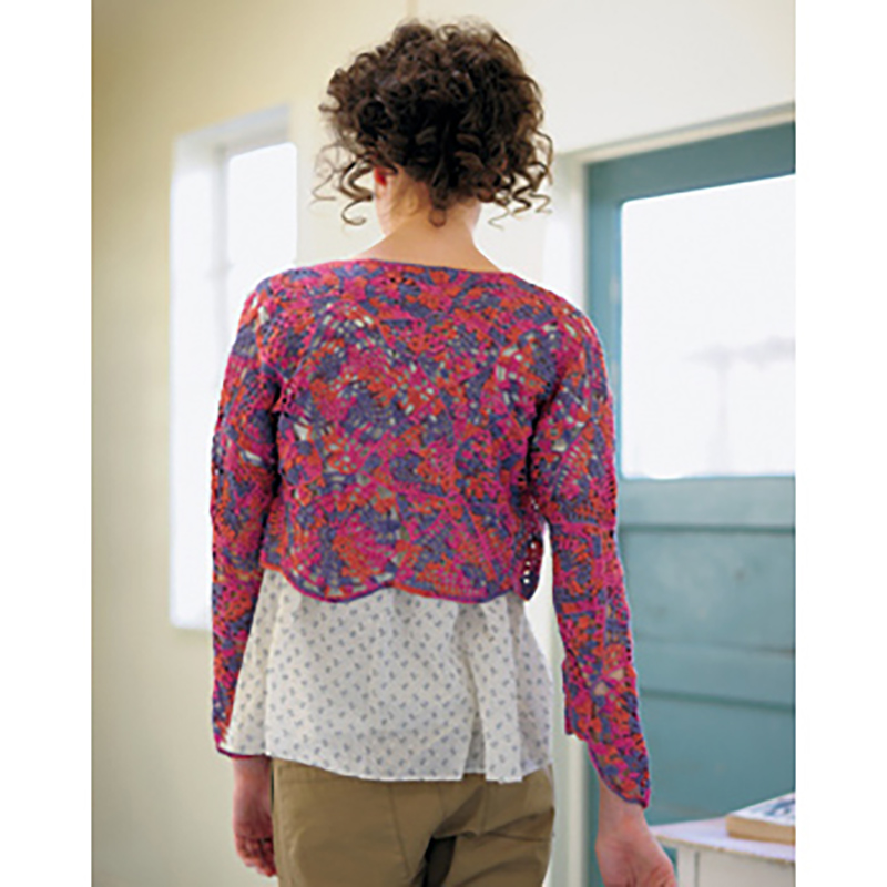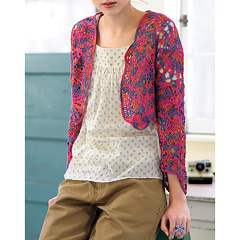大小さまざまなモチーフをパズルのように組み合わせた、アシンメトリーのボレロ。段染め糸の色の変化と相まって、大輪が咲いたような華やかな雰囲気を漂わせます。