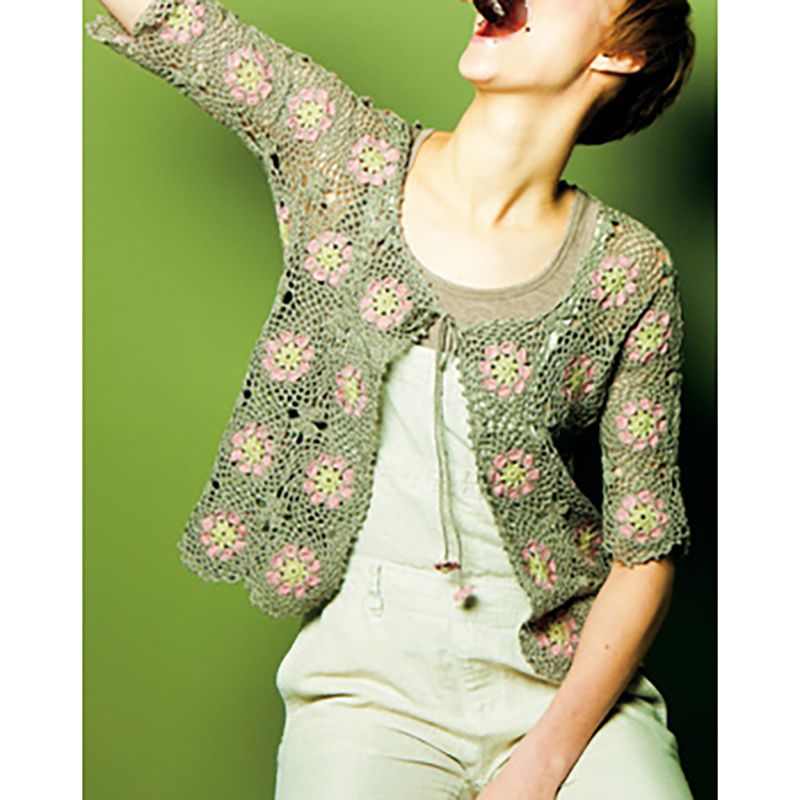 全部が連続モチーフのカーディガンは、お花のピンクの段まで編んでおいて、間は続けてつなぎます。ひもの先に付いた小花もかわいい。