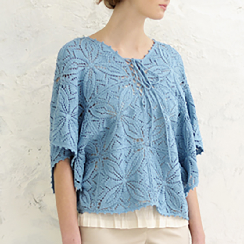 クンスト編みの四角いモチーフを、22枚編んでつなげたプルオーバー。ネック部分はモチーフをつながず縁編みを編んでいます。バックスタイルは、広めの開きでセクシーに。