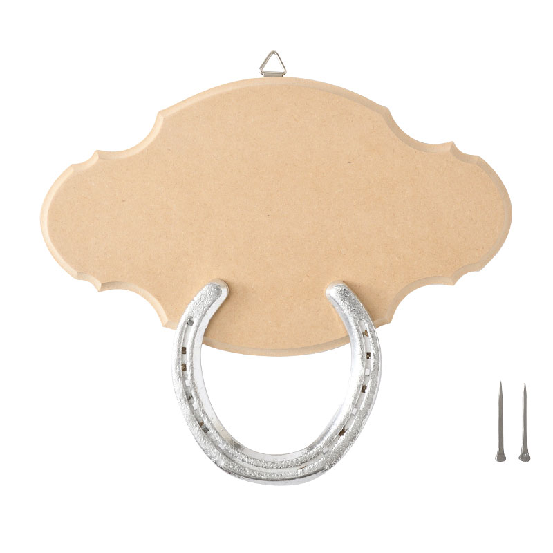 クラシカルな形のプレートと、幸運のアイテムとして欧米で玄関に飾られることの多い馬蹄のセットしたウエルカムボード。