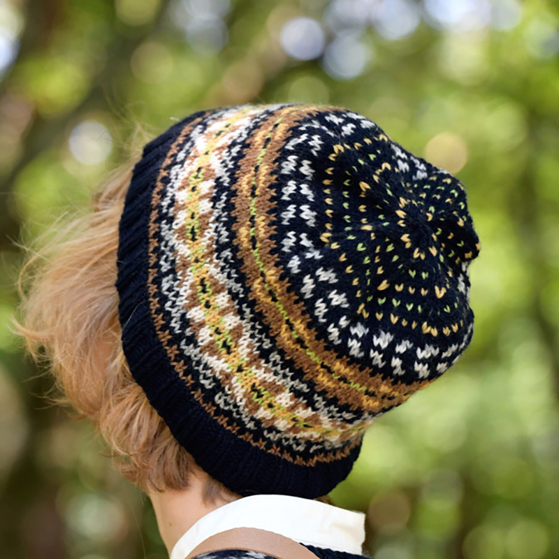 細めのウール糸でベストとキャップをお揃いで。茶系を濃紺で締めている ので、茶系・黒系どちら系統のスタイリングにも合います。シェットランド ヤーンにはない柔らかな肌触りはお肌の弱い方にもおすすめです。※こちらのレシピは帽子のみです。