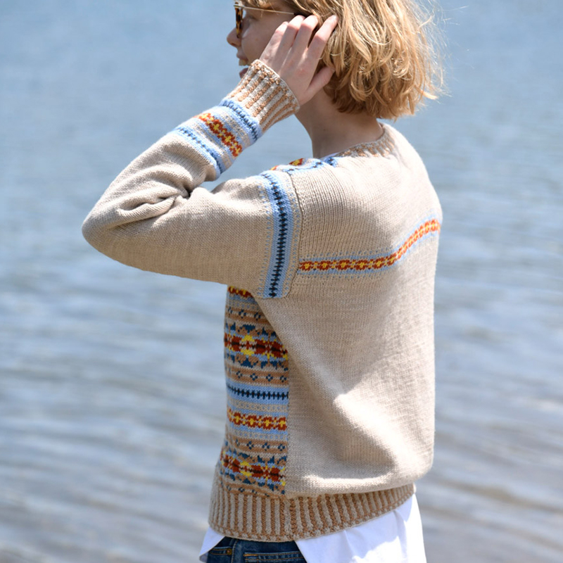 全面の編み込みは前身頃にとどめ、後ろ身頃と袖には模様の一部分をアクセントにあしらって、すっきりとまとめました。気負わずナチュラルに着られるフェアアイルカーディガンです。