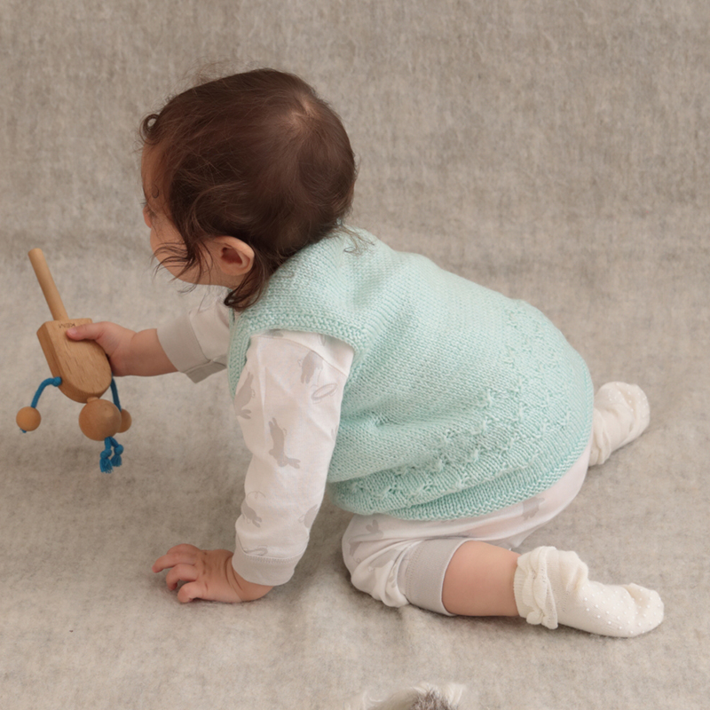 ベビーものといえば、やっぱり編みたい色ナンバーワンのピンク、性別を問わず人気の黄色ベースに、キャンディのようなポップなカラーがかすり調に現れる黄系ミックス。脱ぎ着がラクな胴着は、ベビーニットの必需品です。脇がゴロゴロしないよう前後を続けて編むのがお約束。青緑はちょっと長めのサイズです。