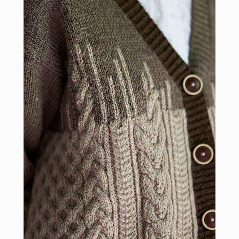 さまざまなケーブルを組み合わせたアラン模様。色の切り替え部分でケーブルがほどけて上に伸びていくような、ユニークなデザインです。
