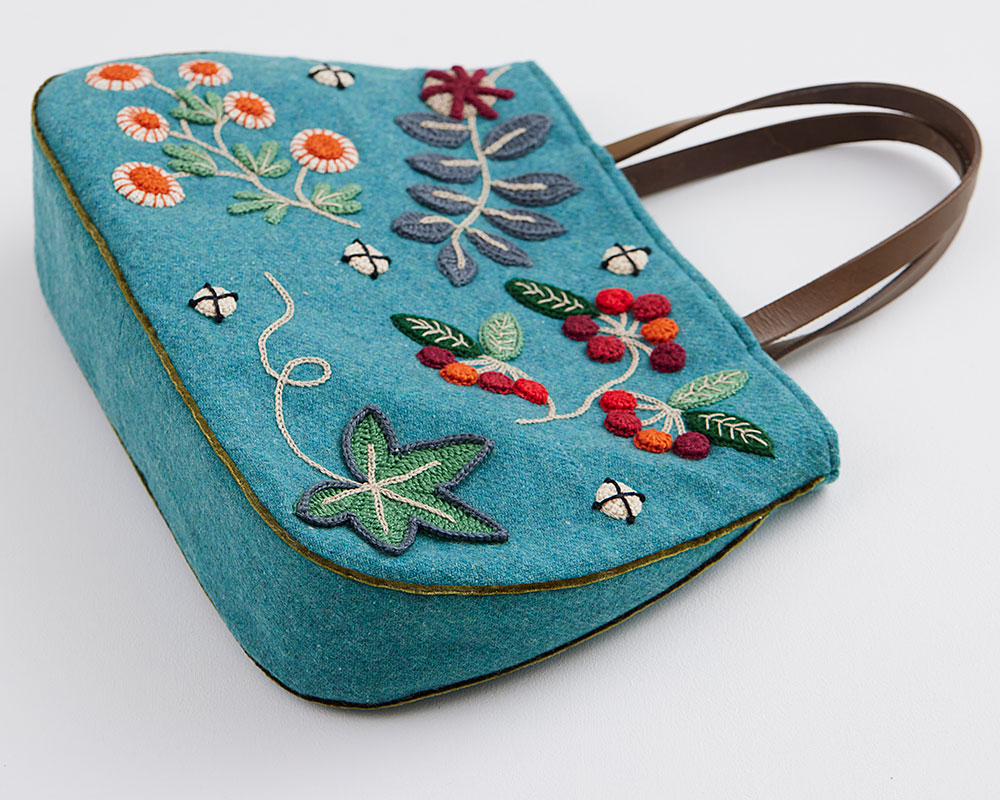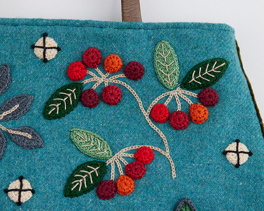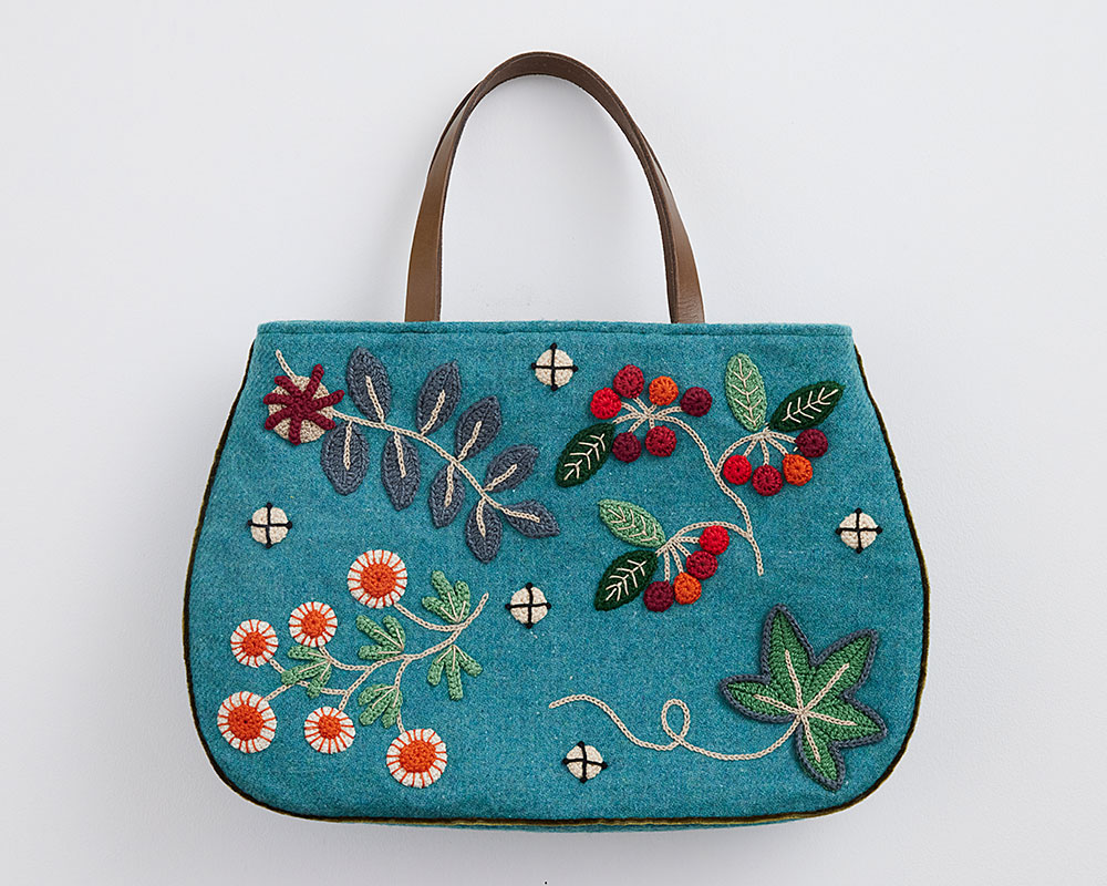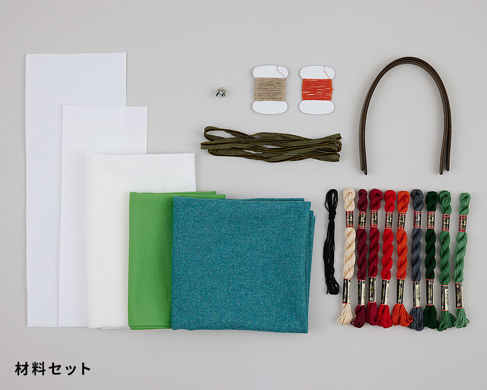 毛糸 Jamieson’s 24色(チャコールグレイは25g×4玉)、裏地(グログラン・ターコイズグリーン)、持ち手用デニム、シャープ芯(中厚)、薄手接着芯(紺)、ポリ芯(刺しゅう型用)、本革の持ち手(黒)1組、エナメルリング4個、麻糸(ホワイトレーン16/3)、たこ糸3号(生成り・黒)、チェコ製ウッドビーズ(約200個)、力ボタン(1個)、レッスンシート(作り方解説書)A4×10ページ、実物大図案・型紙1枚