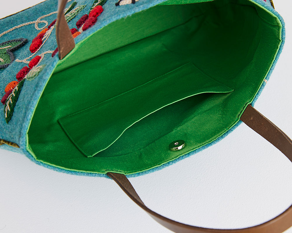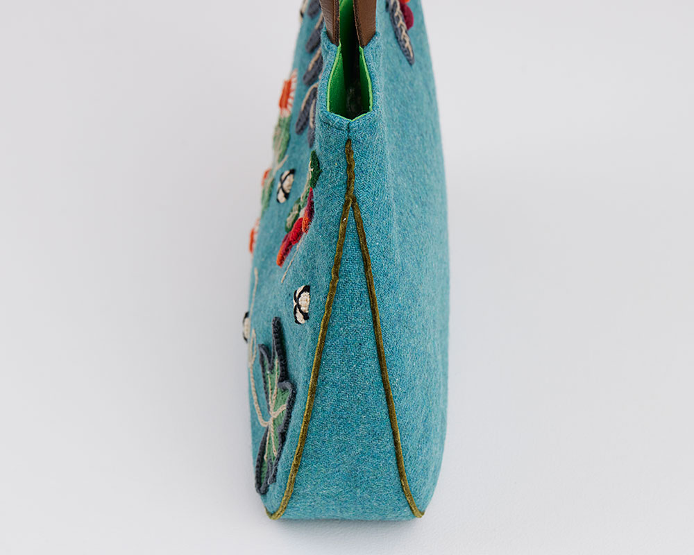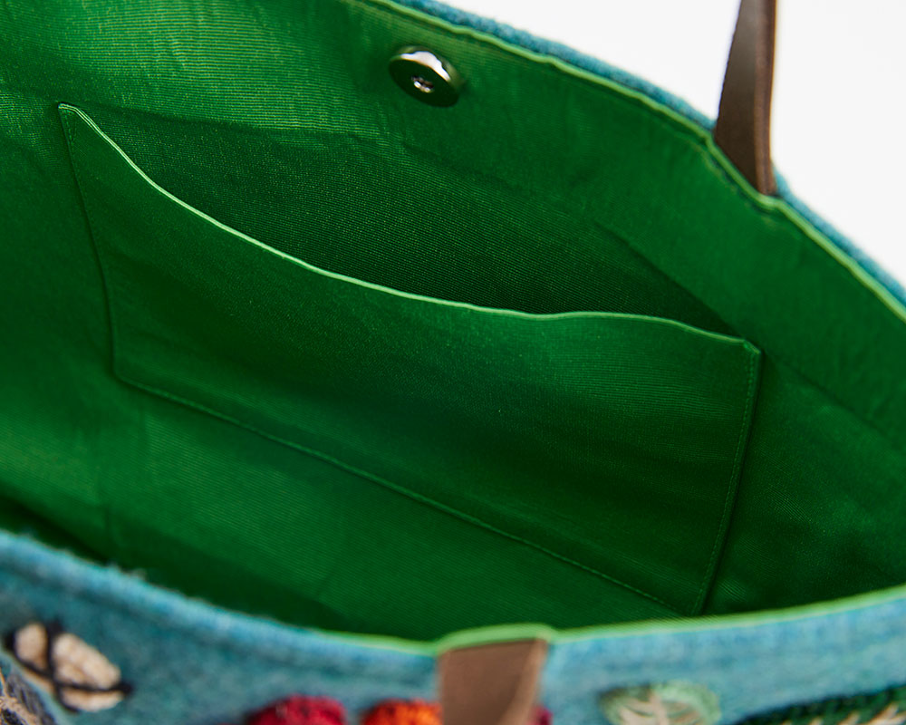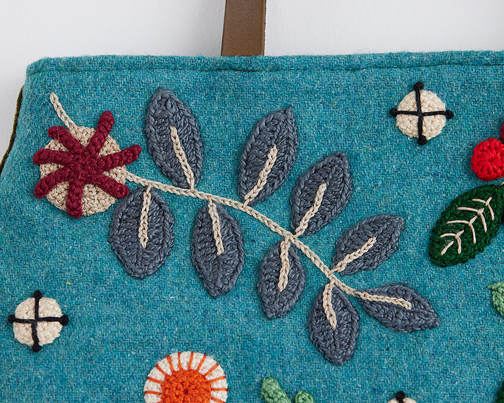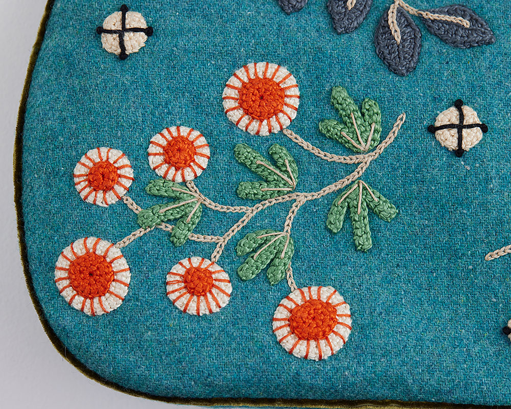 毛糸 Jamieson’s 24色(チャコールグレイは25g×4玉)、裏地(グログラン・ターコイズグリーン)、持ち手用デニム、シャープ芯(中厚)、薄手接着芯(紺)、ポリ芯(刺しゅう型用)、本革の持ち手(黒)1組、エナメルリング4個、麻糸(ホワイトレーン16/3)、たこ糸3号(生成り・黒)、チェコ製ウッドビーズ(約200個)、力ボタン(1個)、レッスンシート(作り方解説書)A4×10ページ、実物大図案・型紙1枚