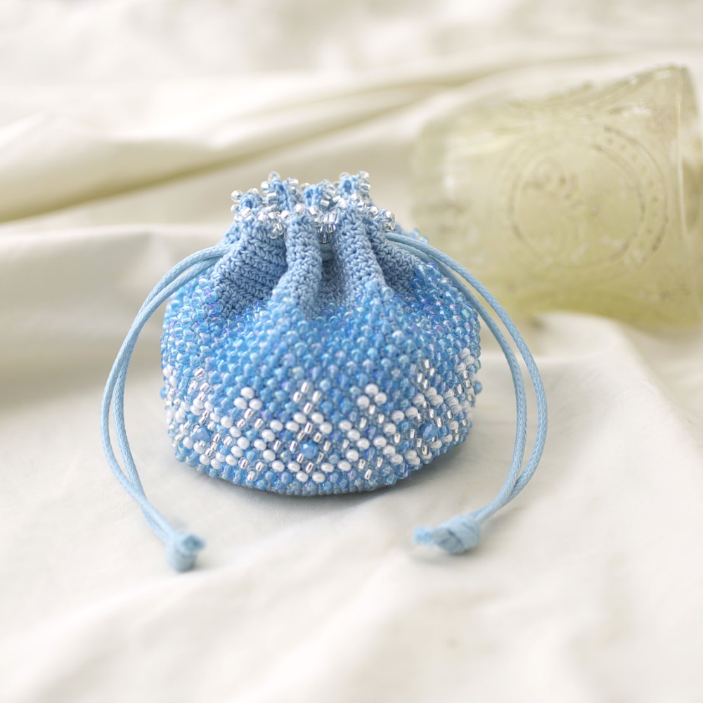 ビーズを編み込みながら作る 使いやすい小物とアクセサリー さわやかなブルーが目を引く、美しい巾着が作れるキットです。