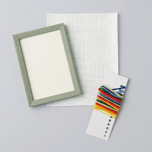 材料セット(フレーム・刺繍布・刺繍糸)、説明書など※日本製