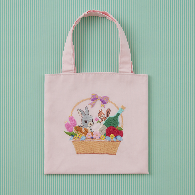 <このレッスンで作れる作品> 青い鳥とうさぎのブローチ、くまの巾着、ピクニックのミニトートバッグ
