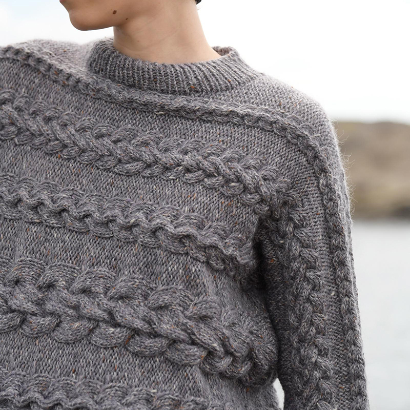 漁師にとっての命綱、農夫が収穫物を束ねる大切な縄、日々の生活に欠かせないアラン模様の代表モチーフ、ケーブルを横編みに。身頃から袖へとつながるダイナミックな大小のケーブルが新鮮な表情を見せてくれます。