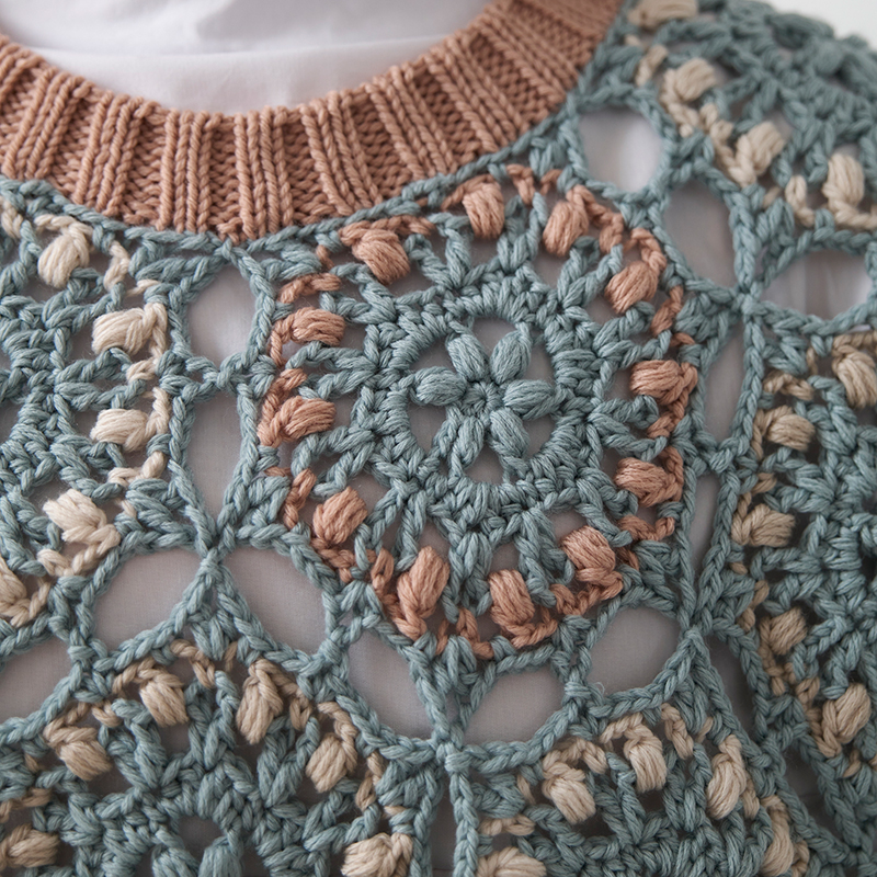 変わり玉編みの1段だけ色を変えたモチーフと、つないだときの透け感が可愛らしいベストです。裾、衿、袖口は棒針編みの2目ゴムですっきりと。効果的なハイブリット仕様が、モチーフつなぎの甘さを引き締めてくれます。